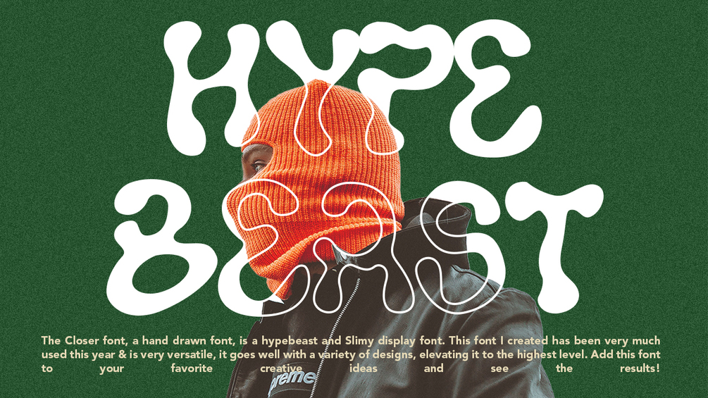 The Closer font, a hand drawn font, is a hypebeast and Slimy display font. This font I created has been very much used this year & is very versatile, it goes well with a variety of designs, elevating it to the highest level. Add this font to your favorite creative ideas and see the results!