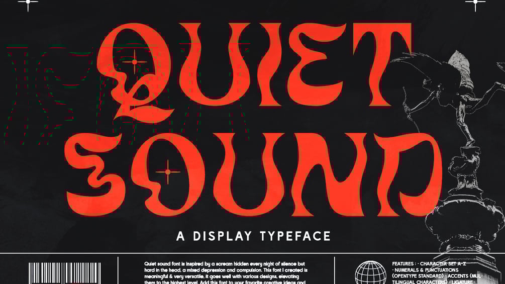 Quiet sound font is inspired by a scream hidden every night of silence but hard in the head, a mixed depression and compulsion. This font I created is meaningful & very versatile, it goes well with various designs, elevating them to the highest level. Add this font to your favorite creative ideas and see the results!